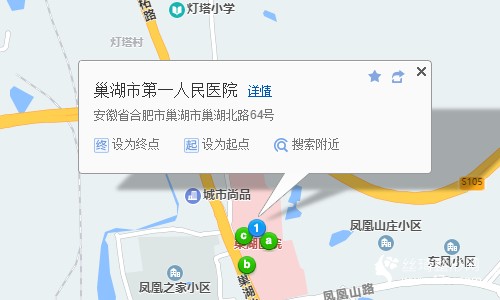 巢湖站710米向西步行 到 鳳凰山辦事處(巢湖萬達(dá)廣場)3站乘 H115路 (柘皋汽車站方向) 或H116路 H121路 H120路A線 H117路 到 安醫(yī)附屬巢湖醫(yī)院300米向北步行 到 巢湖市第一人民醫(yī)院