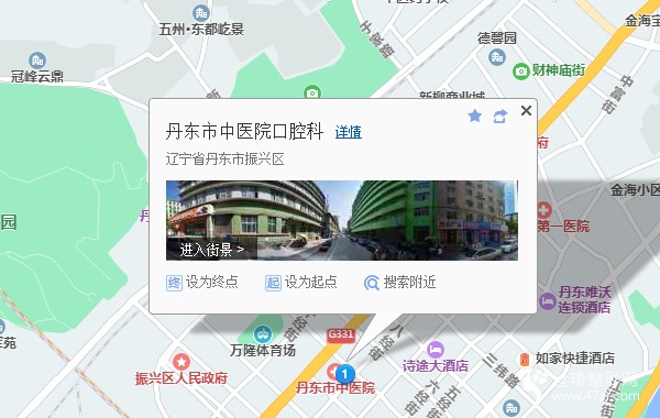丹東客運(yùn)站310米向北步行 到 站前1站乘 126路 (玫瑰港灣東方向) 到 六緯路10米向西北步行 到 丹東市中醫(yī)院口腔科