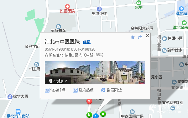淮北北站1.5公里向西南步行 到 李樓村7站乘 3路 (鳳凰山開發(fā)區(qū)方向) 到 一中南門1.8公里向南步行 到 淮北市中醫(yī)醫(yī)院
