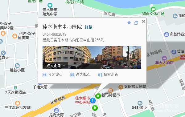 佳木斯火車站270米向西步行 到 火車站3站乘 15路 (長青樓方向) 或 4路 到 中心醫(yī)院(中山街)190米向西北步行 到 佳木斯市中心醫(yī)院