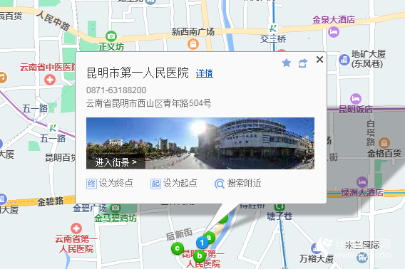 昆明站1公里向北步行 到 雙龍商場1站乘 98路 (蘇家塘方向) 到 巡津街110米向北步行 到 昆明市第一人民醫(yī)院