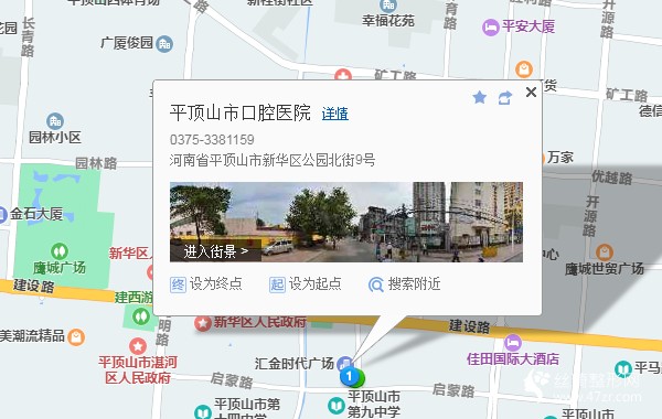 平頂山汽車站5米向北步行 到 聯(lián)通公司(新汽車站)3站乘 67路 (中興科技產業(yè)園方向) 到 平頂山飯店620米向南步行 到 平頂山市口腔醫(yī)院