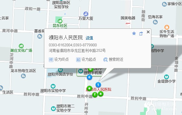 濮陽站560米向北步行 到 火車站9站乘 7路 (采油五廠方向) 到 市日報社380米向東南步行 到 濮陽市人民醫(yī)院