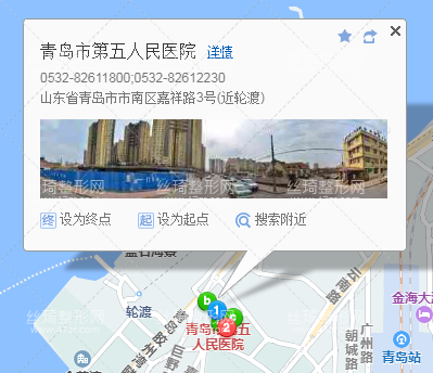 青島站120米向北步行 到 鐵路青島站西廣場2站乘 8路 (四川路滋陽路方向) 到 第五人民醫(yī)院30米向東北步行 到 青島市第五人民醫(yī)院,