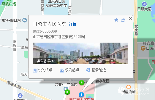 日照站1.1公里向西步行 到 榮安大廈4站乘 5路內(nèi)環(huán) (興業(yè)世紀城方向) 到 市醫(yī)院110米向西步行 到 日照市人民醫(yī)院