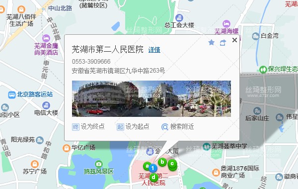 蕪湖站390米向南步行 到 蕪湖站東廣場8站乘 113路(晚) (峨山東路北方向) 到 第二人民醫(yī)院180米向西南步行 到 蕪湖市第二人民醫(yī)院,