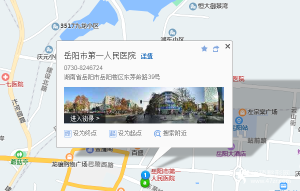 岳陽站700米向東南步行 到 泰和商城1站乘 1路 (解放路方向) 或 19路 16路29路 12路 49路 到 長城市場270米向西步行 到 岳陽市第一人民醫(yī)院