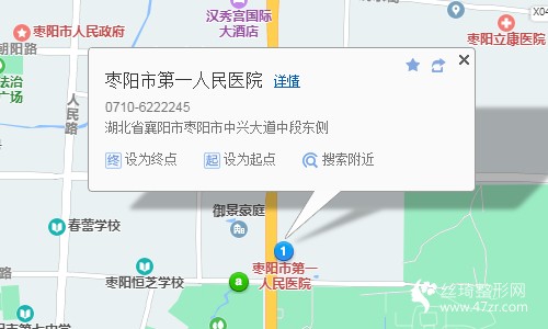 棗陽汽車站510米向東步行 到 內(nèi)觀臺8站乘 棗陽8路 (光彩大市場方向) 到 襄陽路口北340米向南步行 到 棗陽市第一人民醫(yī)院