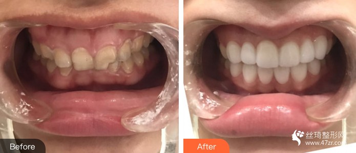 今天再來發(fā)下做完后的果,醫(yī)生做得較為仔細,剛做完上面的牙貼面,給大家來一張下上牙對比圖