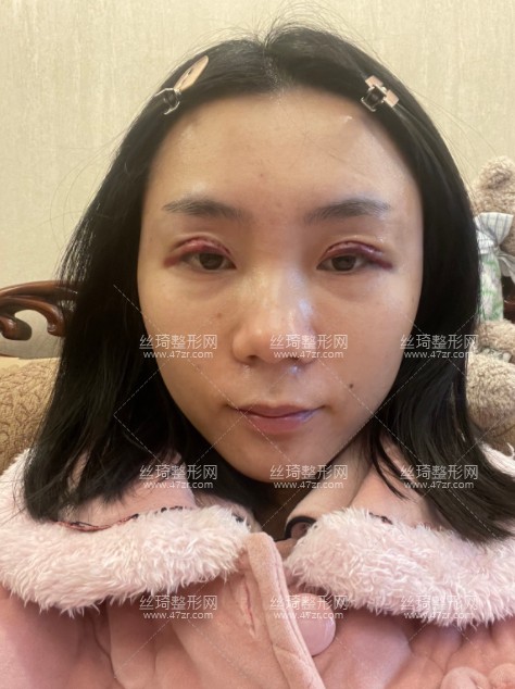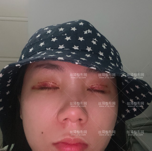 術(shù)后第3天,每天睜開眼睛第一件事情就是照鏡子,由于血液不循環(huán),眼皮還是很腫的,眼皮兒還有點(diǎn)淤青,挺擔(dān)心的,還沒有拆線,現(xiàn)在就想趕緊拆線,看有沒有留疤,閉眼眼睛還是較為對(duì)稱的