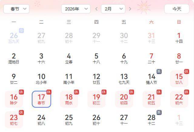 2026春節(jié)放假時(shí)間為: