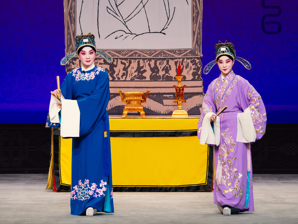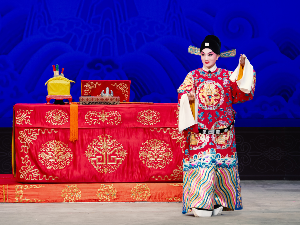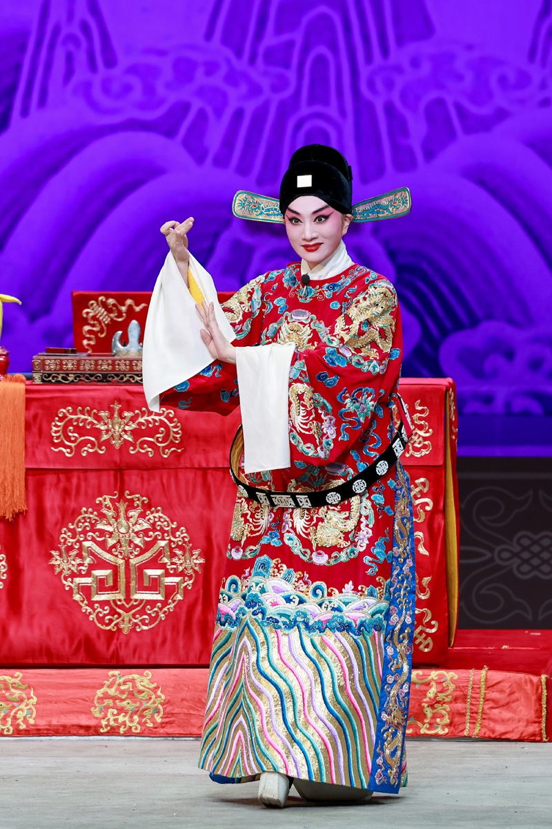 路潔為習(xí)得該劇精髓,自2020年起,每周專程赴天津向京劇名家王艷學(xué)習(xí)了三年。王艷老師對(duì)氣口、勁頭、身段等細(xì)節(jié)的嚴(yán)苛要求,讓路潔精準(zhǔn)把握了謝瑤環(huán)的人物特質(zhì)。作為生旦兩挑的劇目,路潔在劇中既需展現(xiàn)旦行的端莊柔美,又要詮釋小生的軒昂英氣。演出開(kāi)場(chǎng),悶簾一聲“來(lái)了”便收獲碰頭彩,身著巡按紅蟒官服的亮相英氣勃發(fā),完美詮釋了正義化身的形象?!邦^公堂”一折中,堂審武宏的大段念白剛勁有力、張弛有度,將謝瑤環(huán)不畏權(quán)奸的凜然正氣展現(xiàn)得淋漓盡致;“花園”一場(chǎng)則盡顯女兒家的嬌羞柔情,“謝瑤環(huán)深宮九年整” 的南梆子唱腔婉轉(zhuǎn)旖旎,配合遮面團(tuán)扇的細(xì)膩身段與小圓場(chǎng)走位,將與袁行健的情意綿綿刻畫得美不勝收,與小生演員劉明哲的默契配合贏得滿堂喝彩。