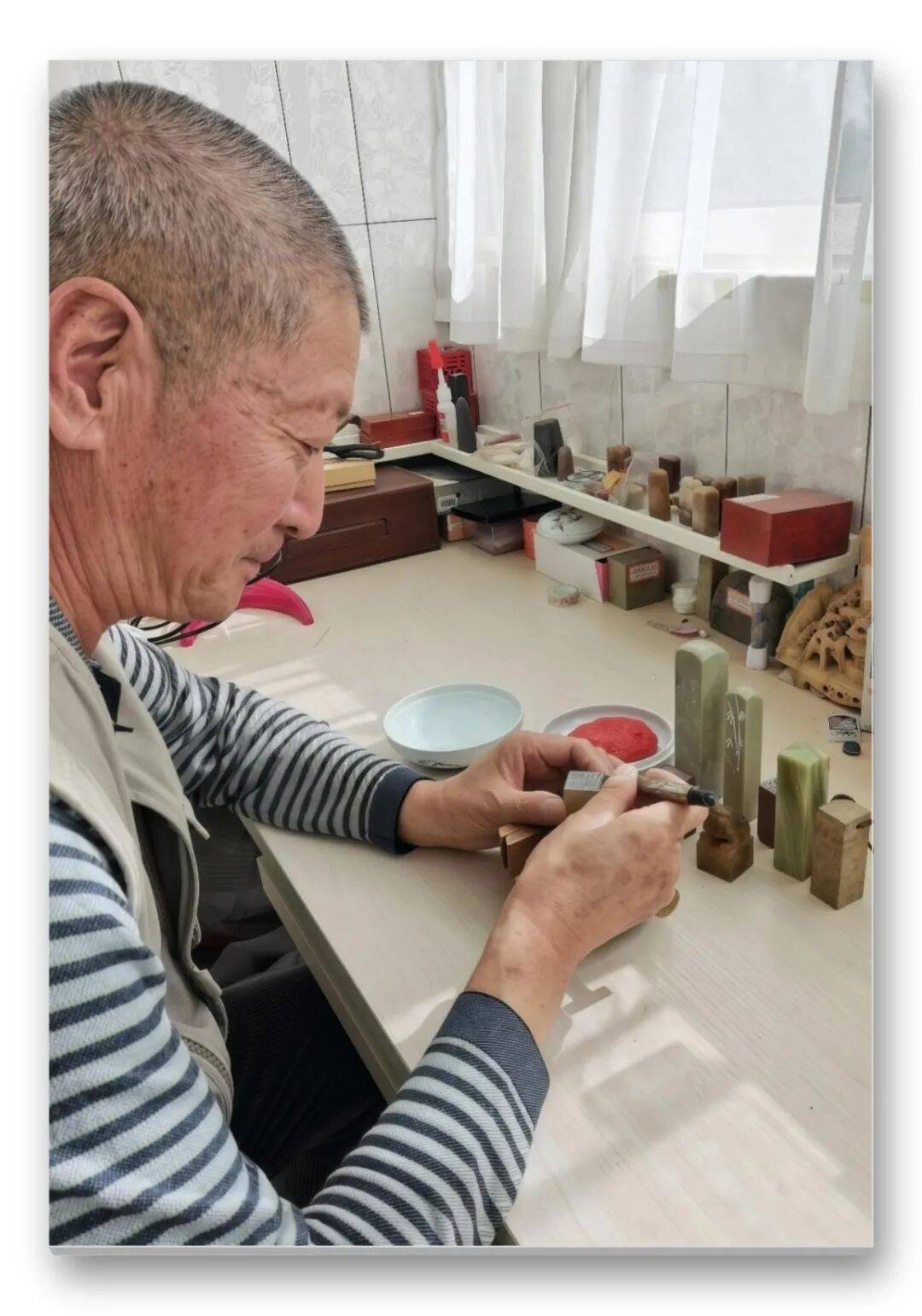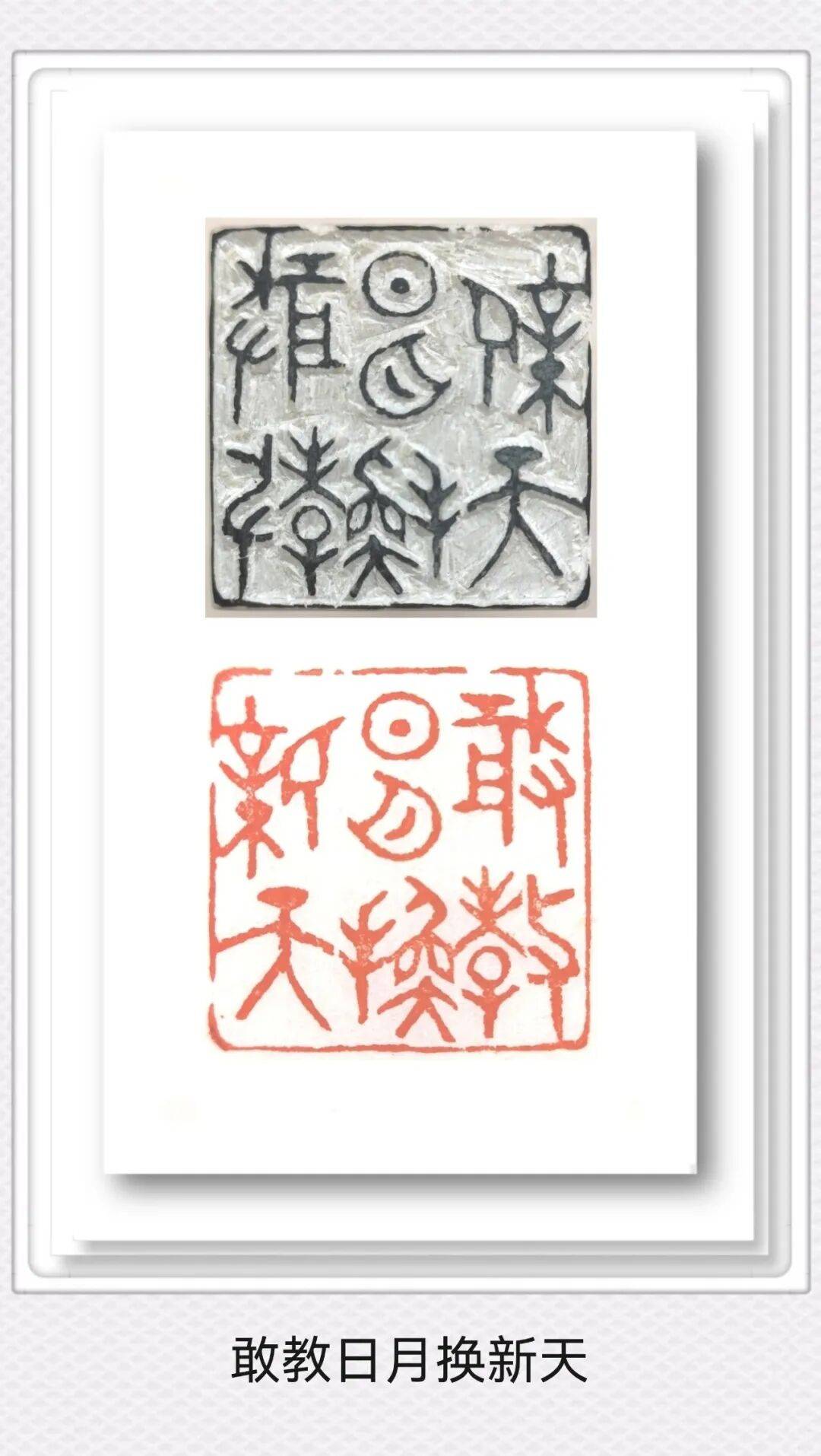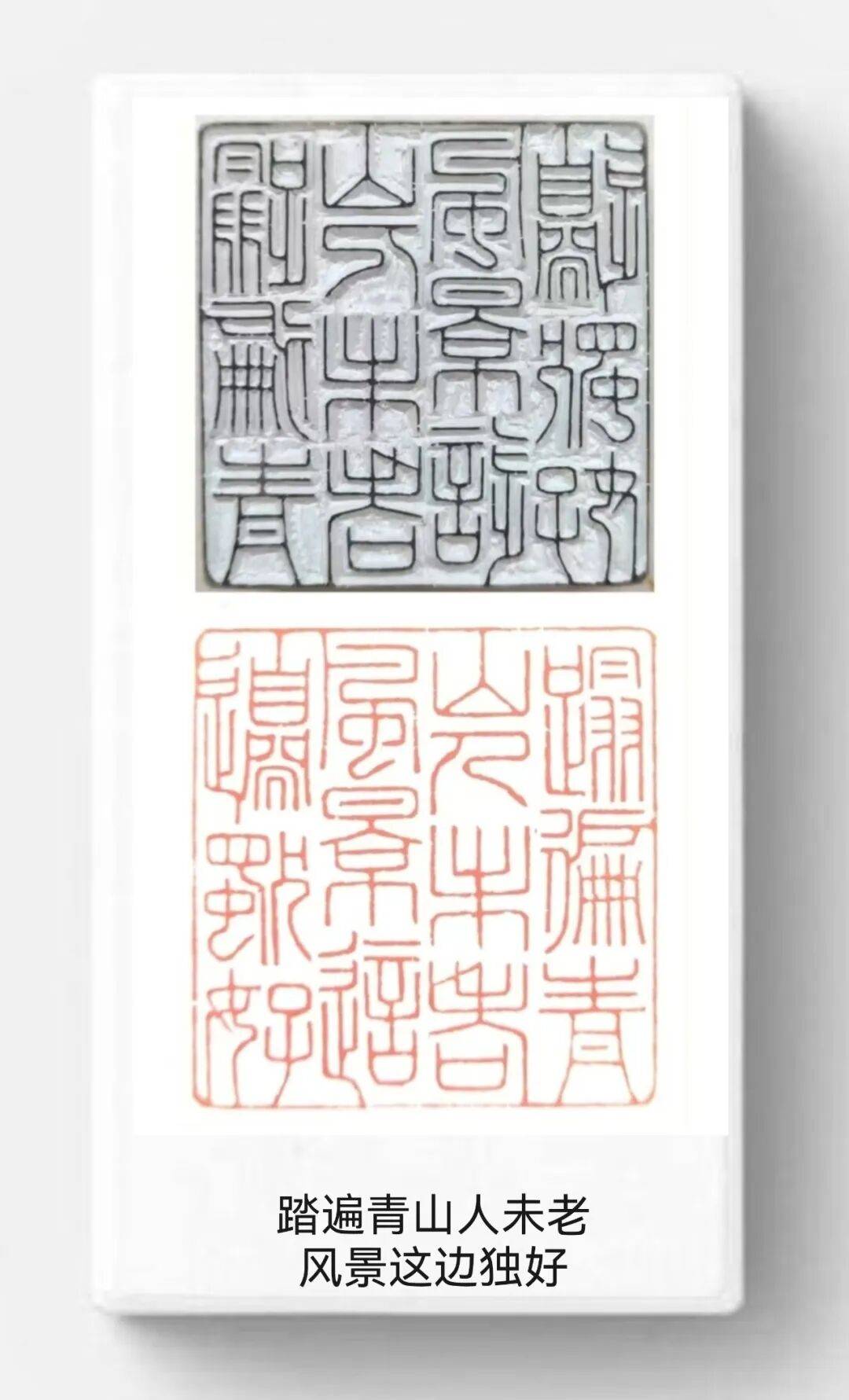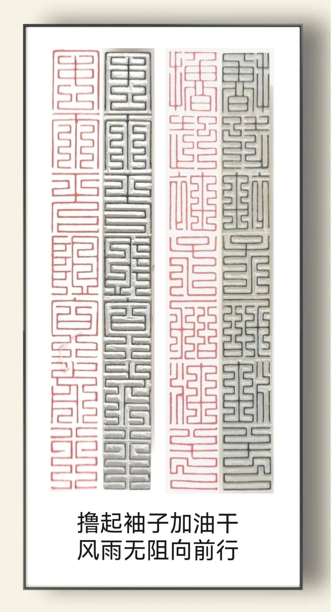 更可貴者,先生以近古稀之軀秉燭探幽,將張家口泥河灣遠(yuǎn)古刻符、蔚縣剪紙鏤空技藝、崇禮滑雪動(dòng)勢(shì)之美,皆熔鑄于青田壽山之中。每方印鈕皆成微縮泥河灣遺址,每道邊欄俱是明長(zhǎng)城雉堞化身。所謂"刀筆寫(xiě)春秋",在楊公處可見(jiàn):三刀兩刃刻盡山河氣韻,一朱一白吞吐時(shí)代風(fēng)云。