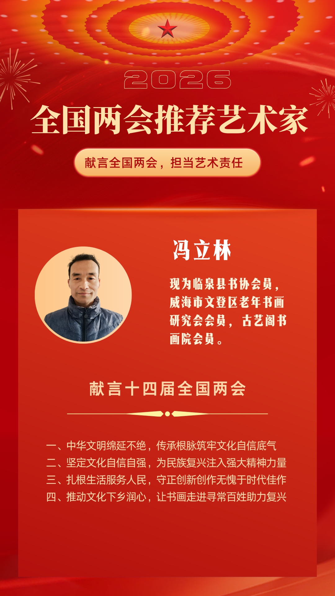 藝術(shù)源于生活,高于生活,一切創(chuàng)作都要為人民服務(wù)。這是馮立林始終堅(jiān)守的創(chuàng)作初心。他生活在農(nóng)村,深知鄉(xiāng)村文化建設(shè)的重要性,也看清了農(nóng)村文化發(fā)展的短板?!稗r(nóng)村最需要文化跟進(jìn),書香要走進(jìn)尋常百姓家,讓文化滋潤(rùn)群眾的心田?!闭劶?/span>此次建言,他直言,文化有著潛移默化的強(qiáng)大力量,能讓百姓愛上書畫、親近經(jīng)典,在書香墨韻中涵養(yǎng)情操、摒棄陋習(xí),讓鄉(xiāng)村處處充滿文雅氣息。
