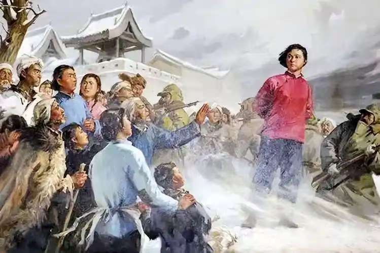 當敵人把劉胡蘭等押上臺時,此時天空中陰云密布,真的紛紛揚揚下起了大雪,一時間露天看戲的人們頭上、衣服上變成了一片白色,就像頓時換上了白衣裳,在為英雄送行一般,真是“驚天地,泣鬼神”??!當“生的偉大,死的光榮”的聲音從幕后傳來時,全體起立,演員們再三鞠躬、謝幕。我們在經(jīng)久不息的掌聲中目送父老鄉(xiāng)親們離場,滿眼淚花的我們,在卸妝之后,還久久不能從劇中人物的情感中擺脫出來。